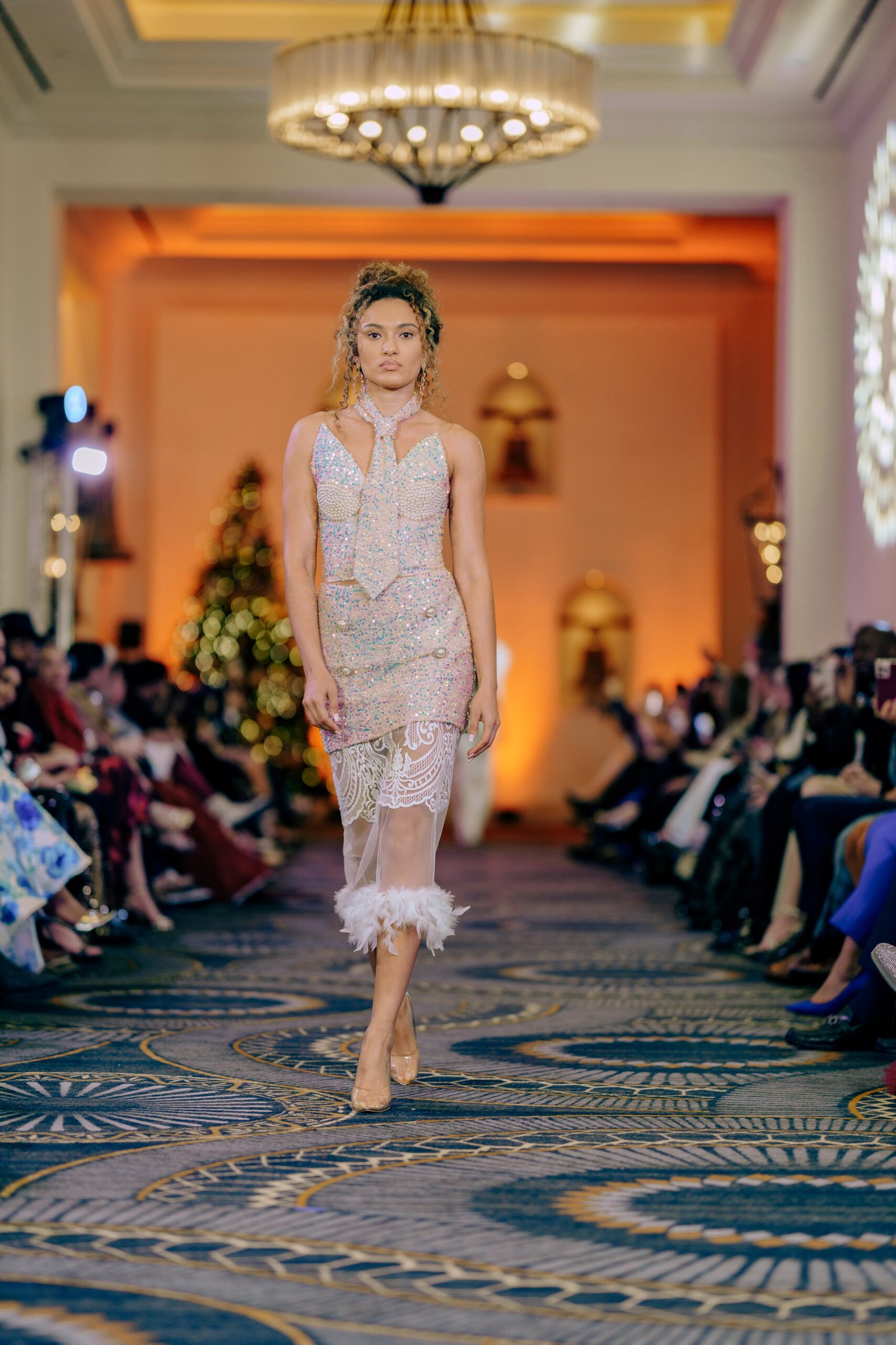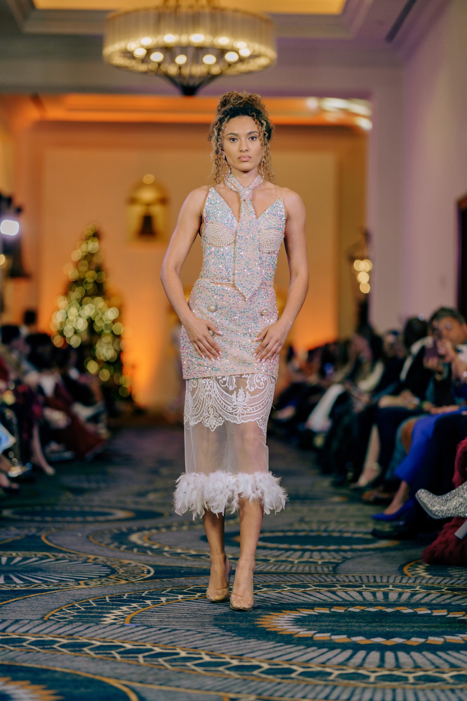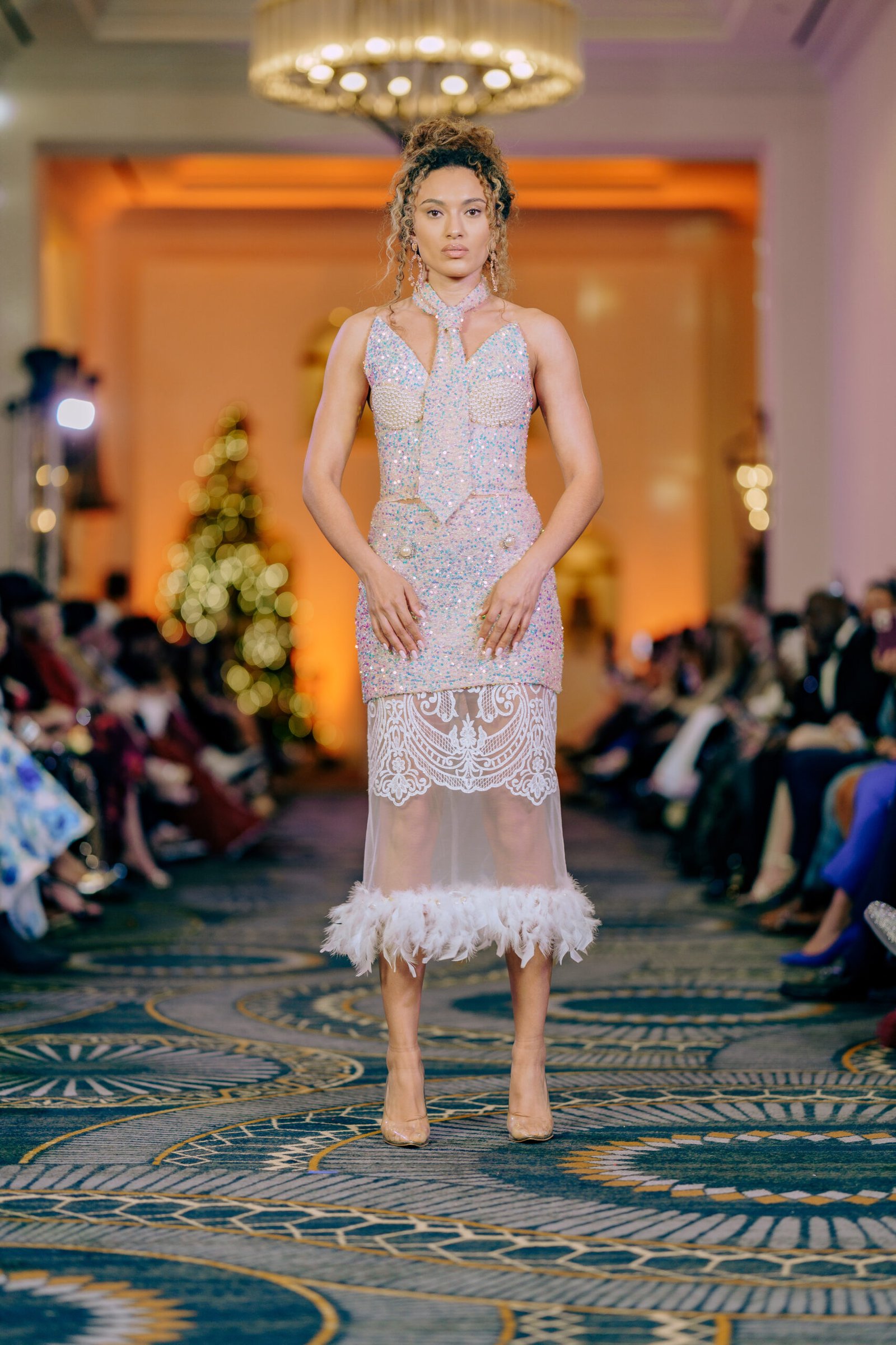The design plays with contrast and movement: a mini skirt reveals a second, sheer underlayer that falls below the knee, finished with delicate lace and feather details for an ethereal, dramatic effect. A signature couture tie adds an unexpected and powerful element, elevating the piece and making it truly one of a kind.