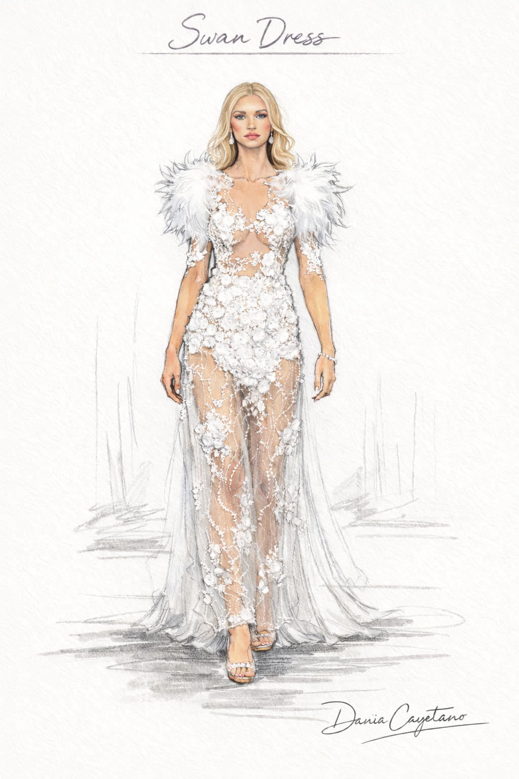 Swan, from the Goddesses Collection, is recreated as a custom couture dress inspired by the grace, purity, and quiet strength of swans. This design celebrates femininity through delicacy, balance, and refined power, honoring the female form with an ethereal and sculptural aesthetic.